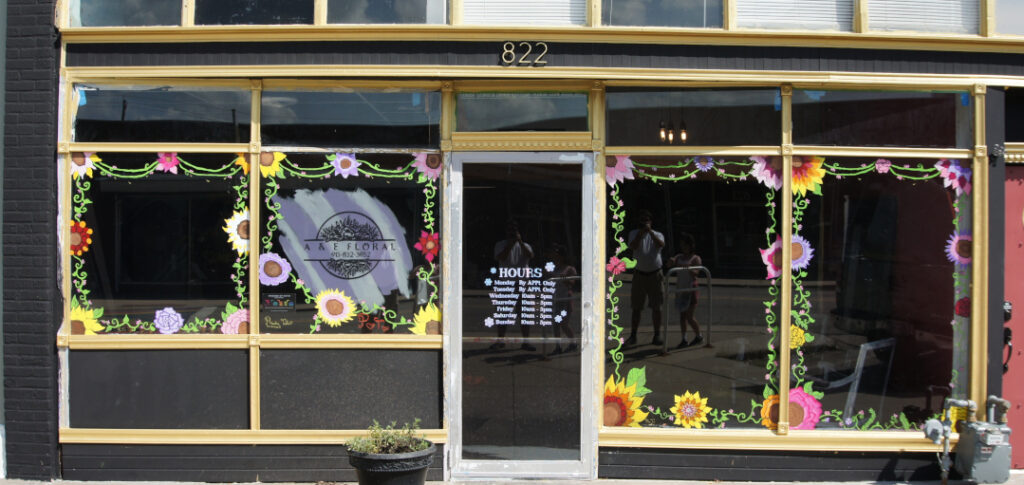 The hand-painted mural frames the glass storefront windows of A & E Floral with an array of bright, whimsical flowers, inviting visitors to experience both art and nature in a single stop. The artwork will remain on display for only 60 days after which the storefront may be redesigned as part of the shop’s evolving look.