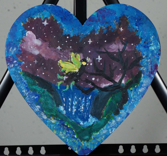 Original acrylic art painting by Phoebe Trites on 10″ heart canvas board created April 2025. Unframed.