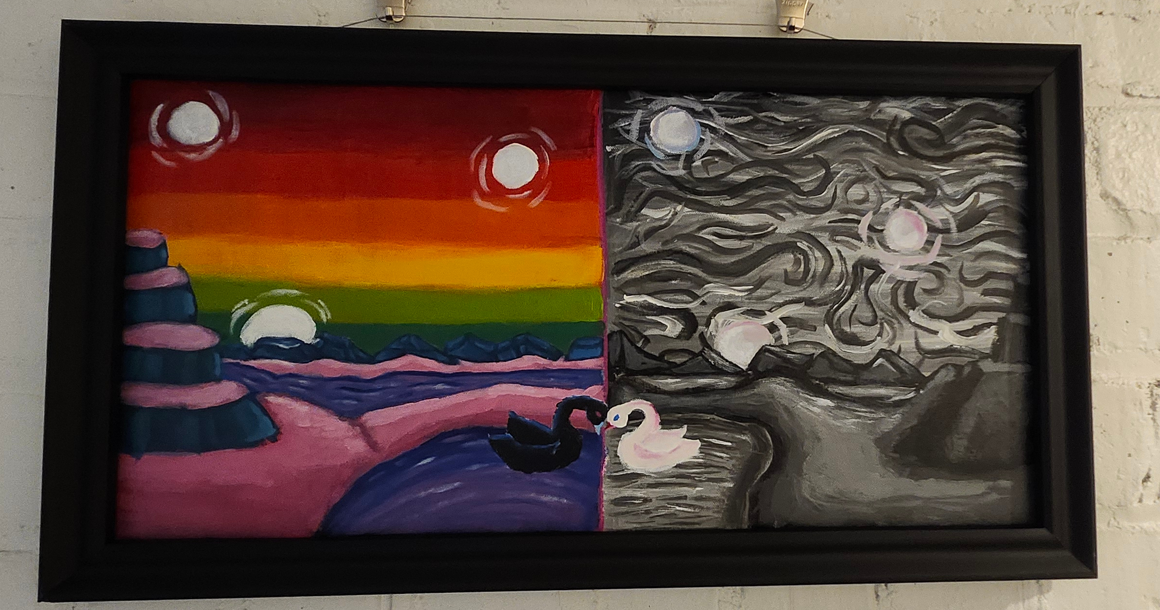 Original acrylic art painting by Phoebe Trites on 12 x 24 canvas created September 2025. Framed.